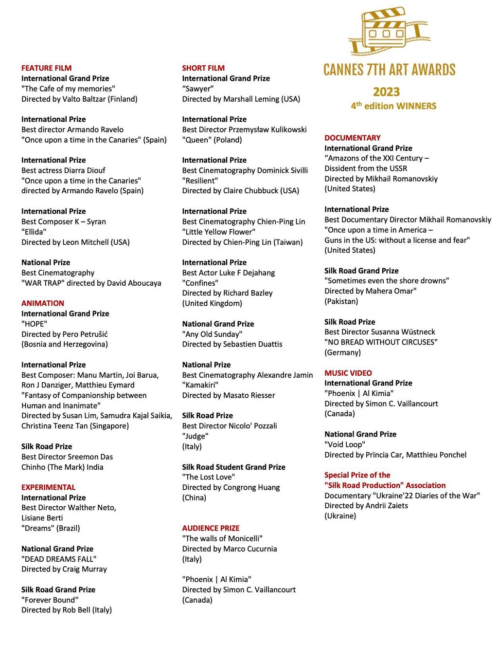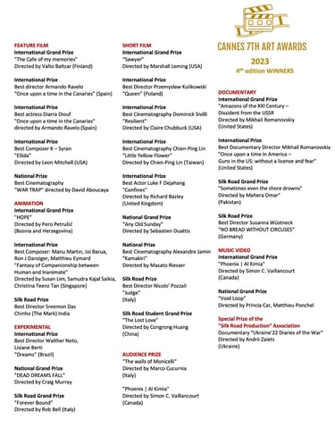 WINNERS OF THE CANNES 7TH ART AWARDS 2023