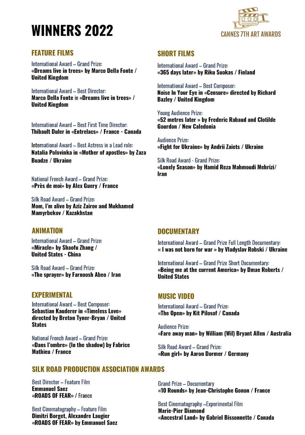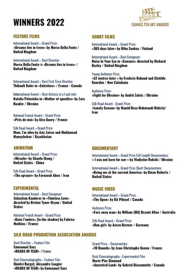 WINNERS OF THE CANNES 7TH ART AWARDS 2022